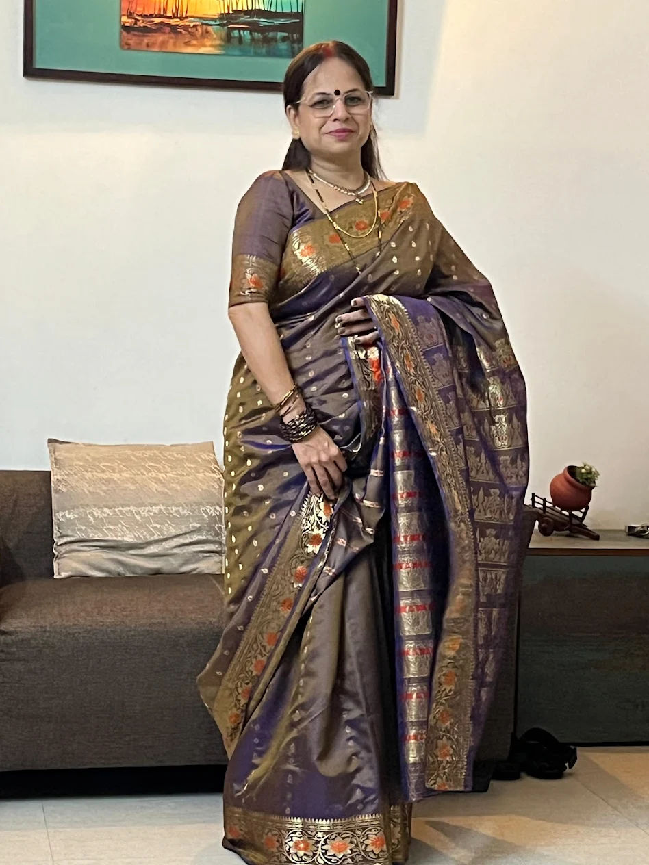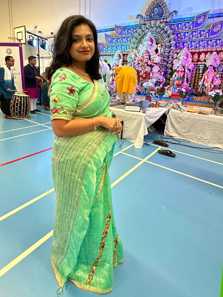 Rangmilap’s collections are unique and beautiful! I am purchasing Rangmilap’s sarees for the past 4 years now and I am very happy with the quality and authenticity of their sarees. I loved wearing this sea green silk Linen with fine hand embroidery saree and also this beautiful Dual tone Katan-e-Nazakat saree during the 2023 Durga Puja festival in Dublin, Ireland and I have received many complements for both sarees and the entire look. All credit goes to Rangmilap