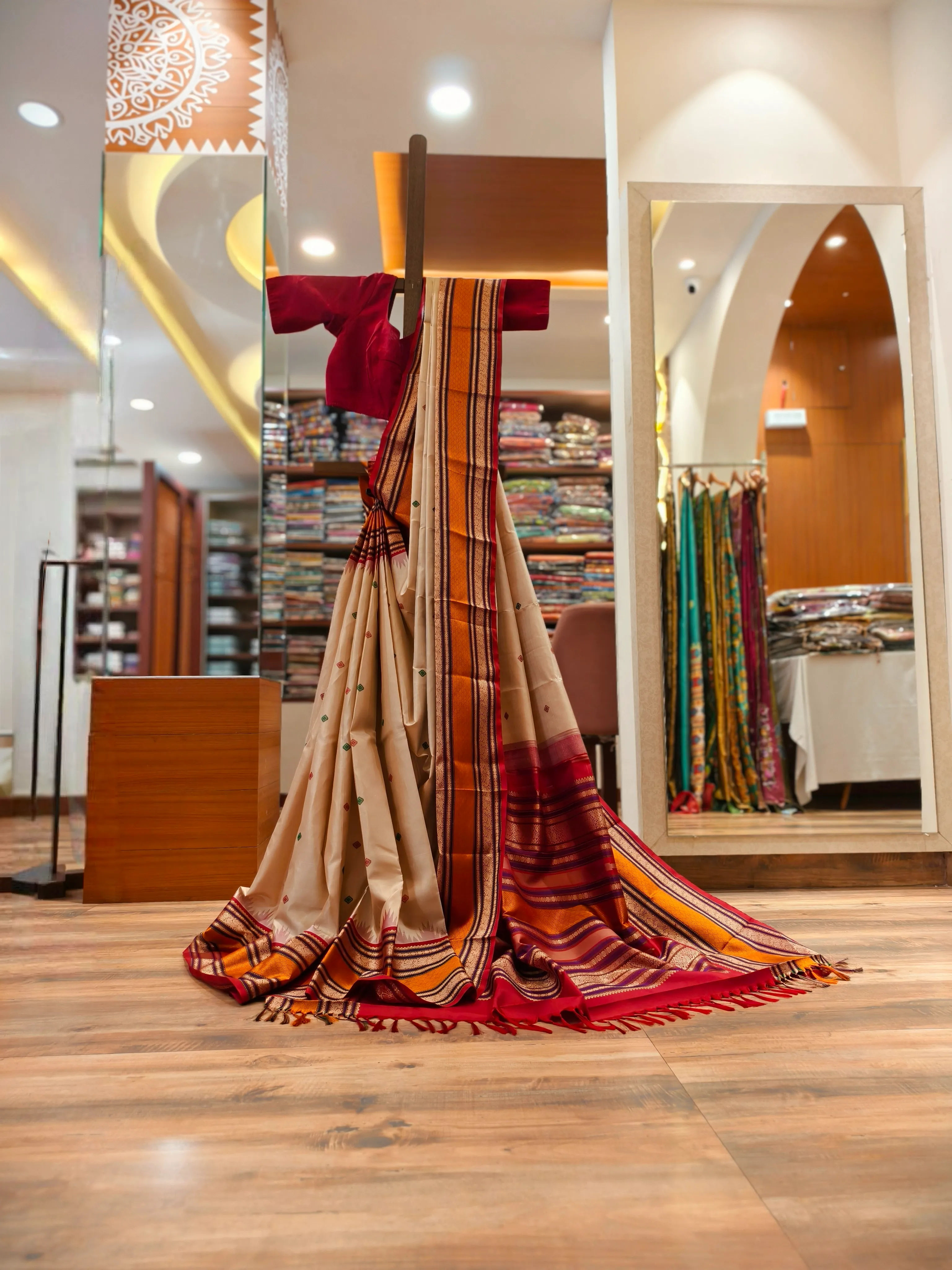 This Silk Gadwal saree is vibrant, festive, and steeped in traditional elegance.The saree features a bright basanti yellow body, giving it a festive and radiant look.It is adorned with subtle small zari buttas spaced evenly across the body, the saree has a striking contrast teal green border on both sides.The border showcases intricate gold zari weaving with traditional floral and paisley motifs.The signature temple style triangular edging in teal separates the border from the body, which is a hallmark of Gadwal sarees.A thin purple selvedge line beautifully frames the border, the pallu is in a rich teal shade, heavily woven with elaborate gold zari brocade work.Perfect for weddings, festivals, housewarming ceremonies, and traditional occasions.